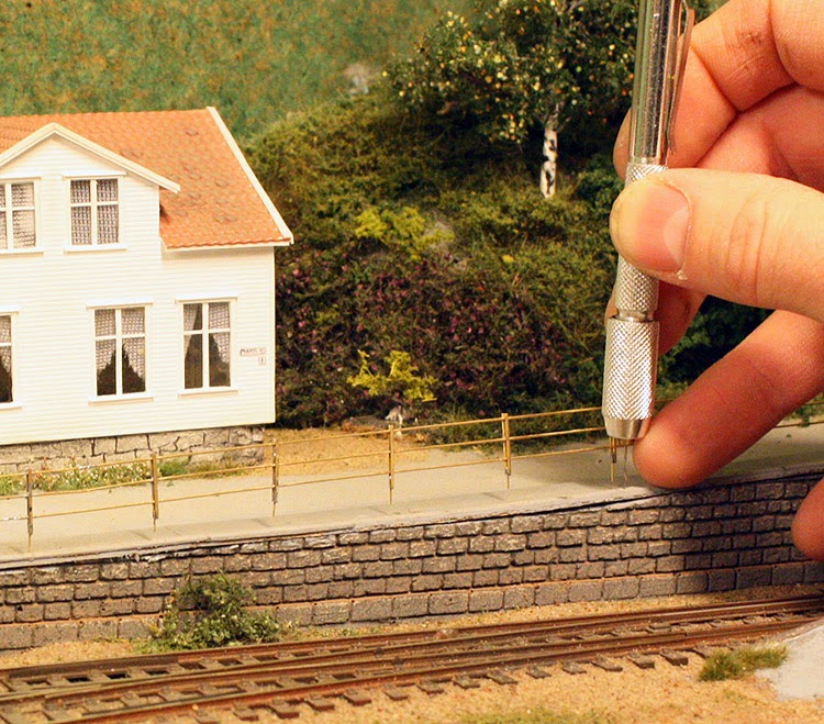 Litt tid til reparasjoner har det iallefall blitt. Noen skinneskjøter er fikset, og jeg har fått loddet sammen et nytt Weinert (nr 3215) gjerde til fortauet på Pharos vei. Til forskjell fra den tidligere varianten har jeg denne gang loddet på en 0.4mm messingtråd på bunnen av hver gjerdestolpe slik at det kommer til å sitte mye bedre. ![]() |